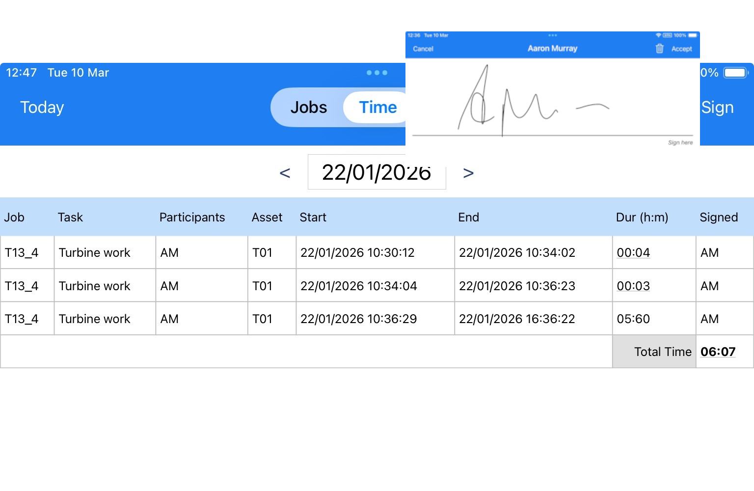 Technicians record the start and end time for each activity on a personal timesheet on their mobile device and sign-off each shift. These times are approved by project managers who review shifts, approving or amending times (if required) from the desktop. We track the actual time a task was started as well as the latitude, longitude and altitude of the technician at that moment.
